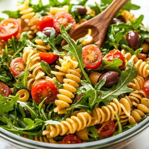 Now it’s time to bring in the greens. Add the arugula to the bowl and toss again. The warm pasta will slightly wilt the arugula, making it tender but still fresh. This step gives the salad a lovely texture soft pasta, crisp greens, and a bit of bite from the arugula.