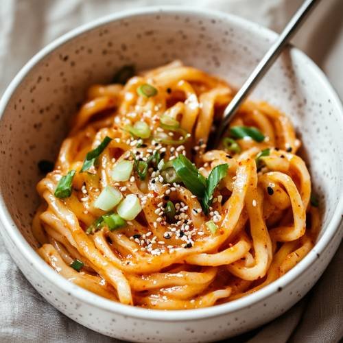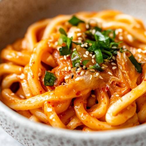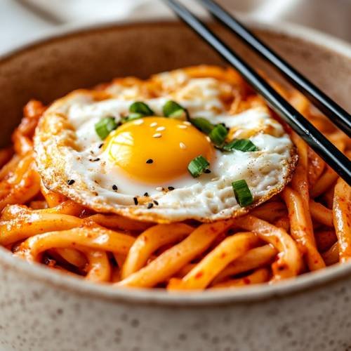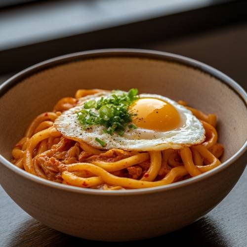 - Garnish & Serve Serve the creamy kimchi udon in a bowl. Top with a crispy fried egg, the greens of the spring onion, and a sprinkle of sesame seeds. If you like, add a bit of parmesan for extra flavor.