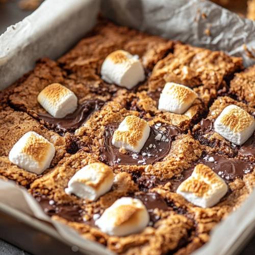 Once baked, take the pan out of the oven and let it cool completely this part is important. If you slice too soon, the bars might fall apart because the marshmallows and chocolate are still soft. Give it time to set so you get clean, gooey-centered squares.