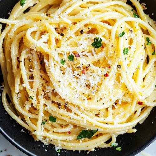 Once the pasta is ready and drained, add it directly to the pan with the garlic butter mixture. Use tongs or a spoon to toss the pasta, ensuring that every noodle is coated with that rich, buttery goodness. As you toss, sprinkle in the fresh lemon zest, squeezing in the juice from the lemon. This is where the bright citrusy flavor really comes through! Add the grated parmesan and a pinch of fresh ground pepper to the pasta, giving it a good toss again to evenly distribute the flavors.