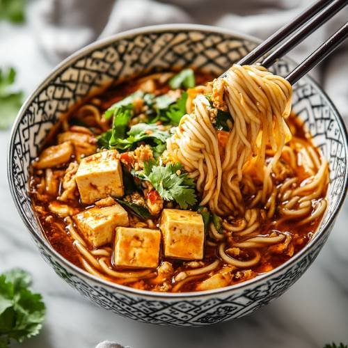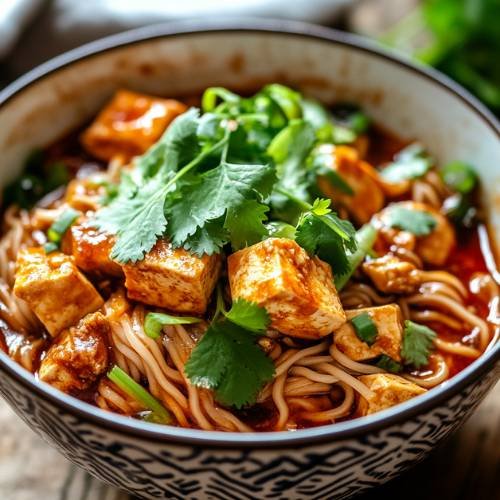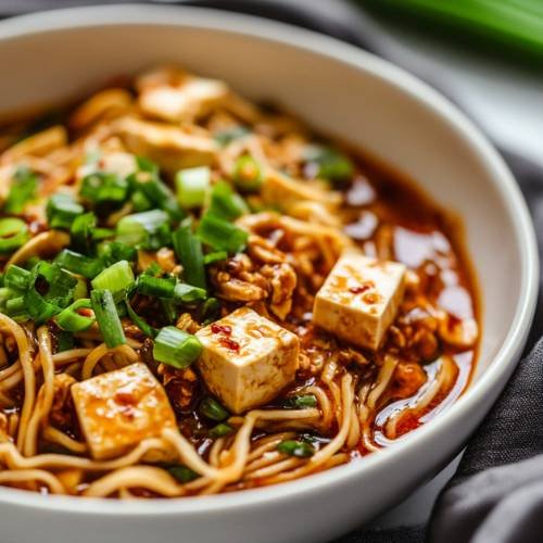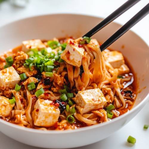 • Serve and Enjoy  Top with sliced spring onions for a fresh crunch and enjoy your fiery, savory Mapo Tofu noodles with chicken!