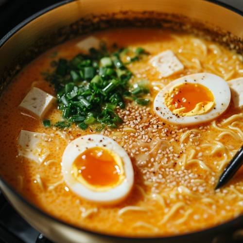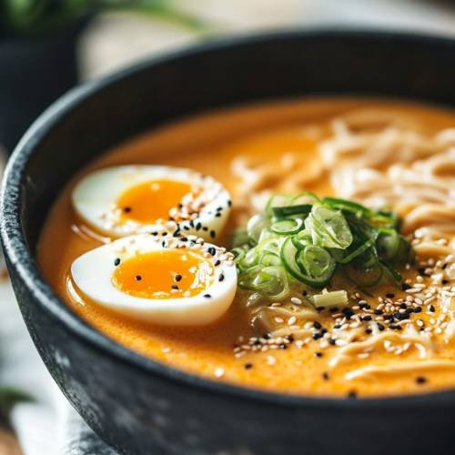Once the noodles are cooked to your liking, it’s time to make this dish even more special! Top your ramen with the green parts of the spring onion for a fresh crunch, a sprinkle of sesame seeds for some extra texture, and a drizzle of sesame oil for a rich, aromatic finish. These small additions will elevate the dish and make it look even more appetizing.