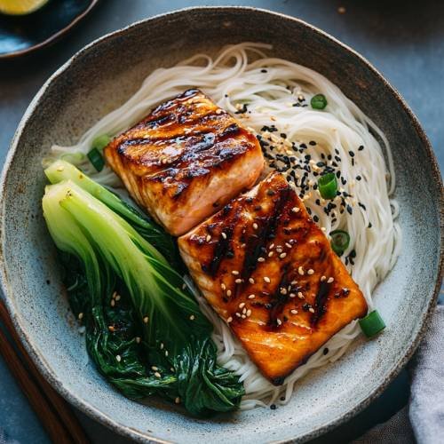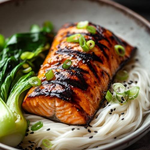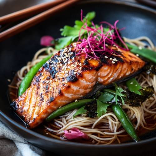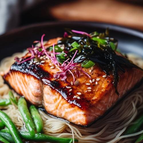 Once all components are ready, it’s time to assemble the dish. Begin by placing the cooled somen noodles into a bowl. Next, pour the hot broth over the noodles. Then, gently place the cooked salmon fillet on top of the noodles. To finish, garnish the dish with chopped spring onions, seaweed, and sesame seeds. For an extra boost of flavor, drizzle the leftover miso marinade (thinned with a little water) over the salmon. If you prefer, you can heat the marinade in a small saucepan over medium heat until it thickens slightly before drizzling it on top.