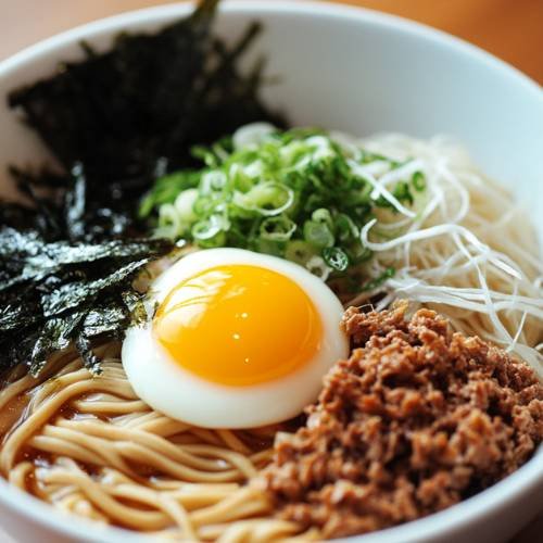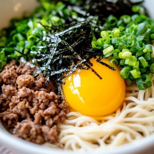 Now it’s time to assemble the dish. Start by adding the glazed spam pieces to the top of the noodles, followed by the diced onion, chopped spring onion, and prawn katsu. For extra flavor and texture, garnish with thin strips of seaweed and a sprinkle of sesame seeds. Don’t forget to top the noodles with the marinated egg yolk (or regular egg yolk), which will give the dish a creamy richness when mixed.
