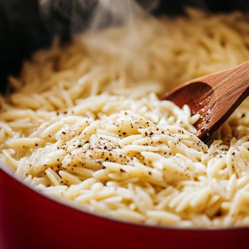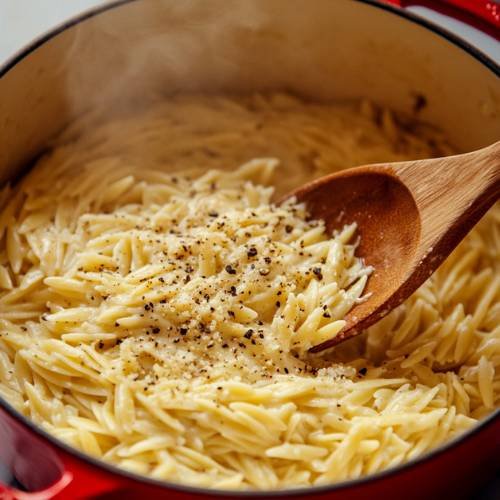 Once the orzo is tender and has absorbed most of the liquid, turn off the heat. Now it’s time to stir in the fresh grated parmesan cheese. The cheese will melt into the orzo, creating a creamy, cheesy texture. Give it a good mix to make sure the cheese is evenly distributed throughout. Taste the dish and adjust the seasoning with more salt or pepper if you want a little extra flavor.