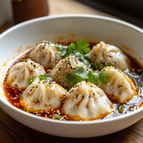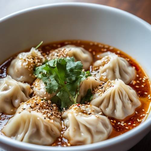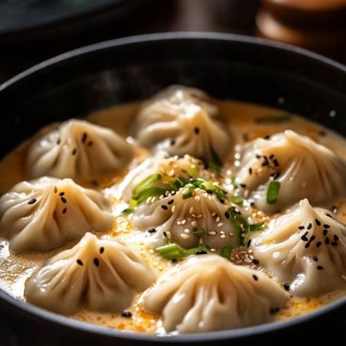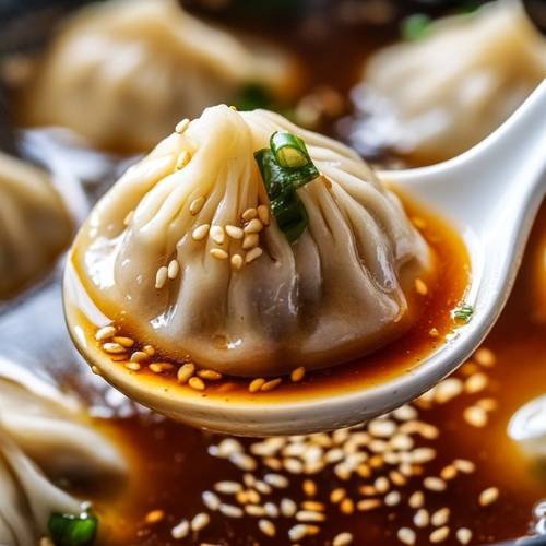 Once your dumplings are ready, uncover the pot. The broth will be aromatic and the dumplings will have absorbed all the rich flavors. Now it’s time to top them off! Sprinkle spring onion over the dumplings for a fresh crunch, and drizzle some chili oil on top for a spicy kick. To finish, add a sprinkle of sesame seeds for texture and an extra touch of flavor. Your soup dumplings in tantanmen sauce are now ready to serve!