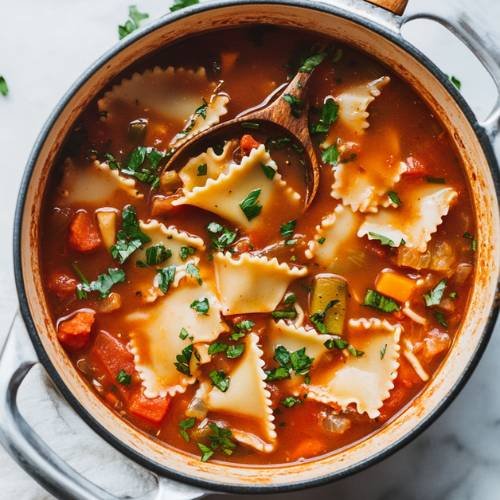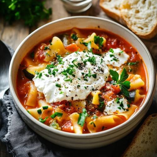 Once everything is cooked and tasting just right, it’s time to serve. Ladle the soup into bowls, then top each one with a generous spoonful of ricotta cheese, a sprinkle of grated parmesan, and a few fresh basil leaves. The cheese melts slightly into the hot soup, making each bite creamy and comforting just like lasagna, but soup-style.
